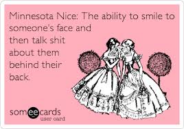 But now and then, as a transplant, a few things about Minnesota truly get on my nerves. Like most transplants, this “Minnesota Nice” stuff gets to me. If you’re not from here, you might not understand that Minnesota Nice is different from bona fide niceness. “Minnesota Nice” means that people are courteous and helpful and give lots of money to charity, and that (unlike in New Jersey), the middle finger isn’t a commonly used traffic signal. But Minnesota Nice also means that people are reserved, not particularly warm, and slow to warm up to strangers. It means they talk behind your back instead of telling you how they feel. It’s passive-aggressiveness to an art.